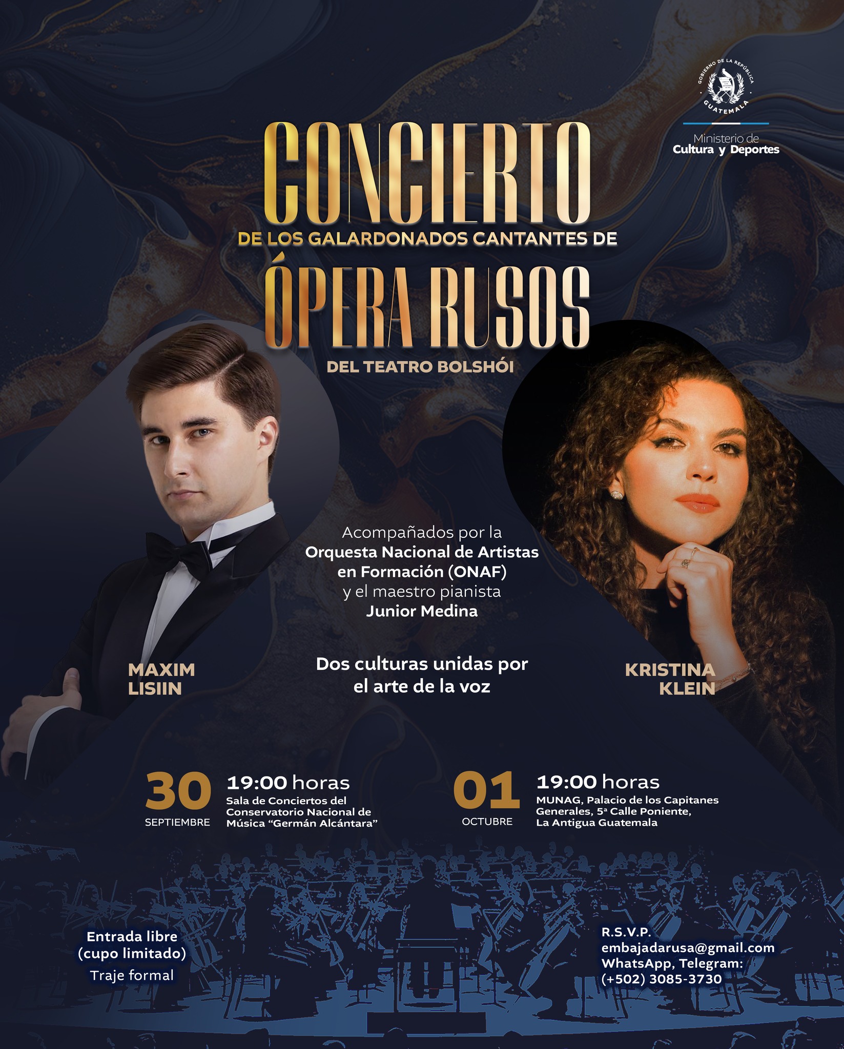 🎶 El Ministerio de Cultura y Deportes, a través de la Dirección de Formación Artística de la Dirección General de las Artes, te invita al concierto de los galardonados cantantes de ópera rusos, acompañados por la Orquesta Nacional de Artistas en Formación (ONAF) y el maestro pianista Junior Medina.