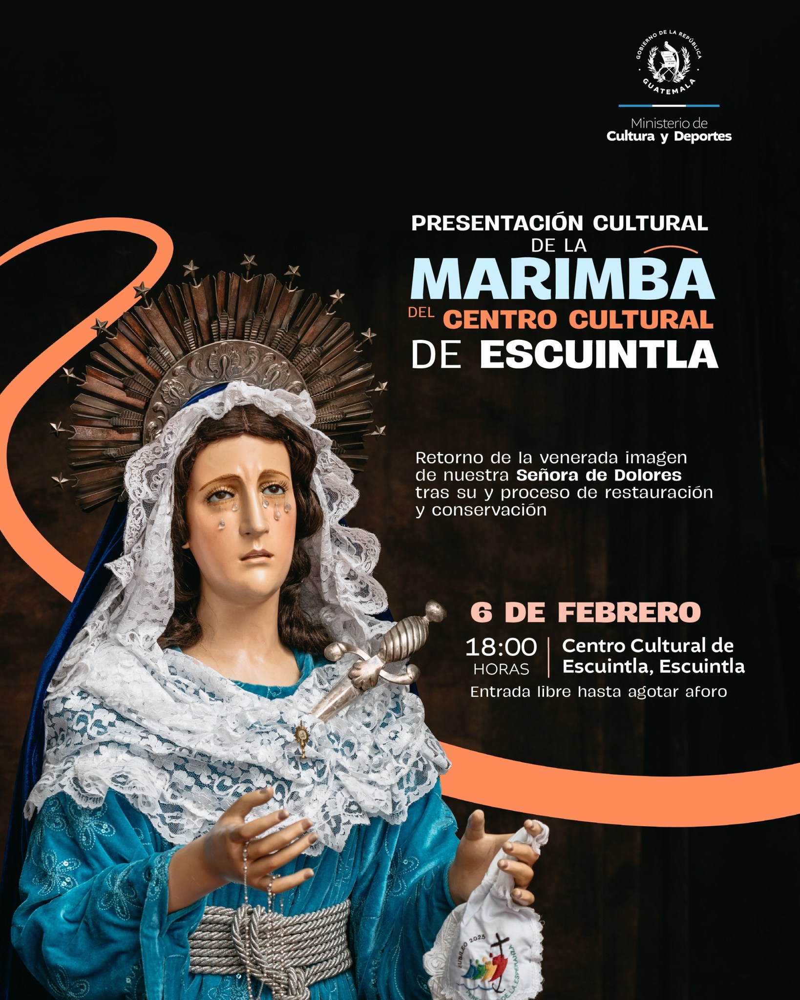 Celebremos el retorno de la venerada imagen de Nuestra Señora de Dolores, tras su proceso de restauración y conservación, con un concierto especial de la Marimba del Centro Cultural de Escuintla.