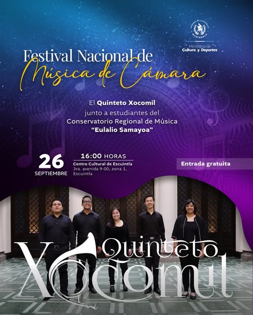 El Festival Nacional de Música de Cámara presenta al Quinteto Xocomil, junto a los talentosos estudiantes del Conservatorio Regional de Música “Eulalio Samayoa”.