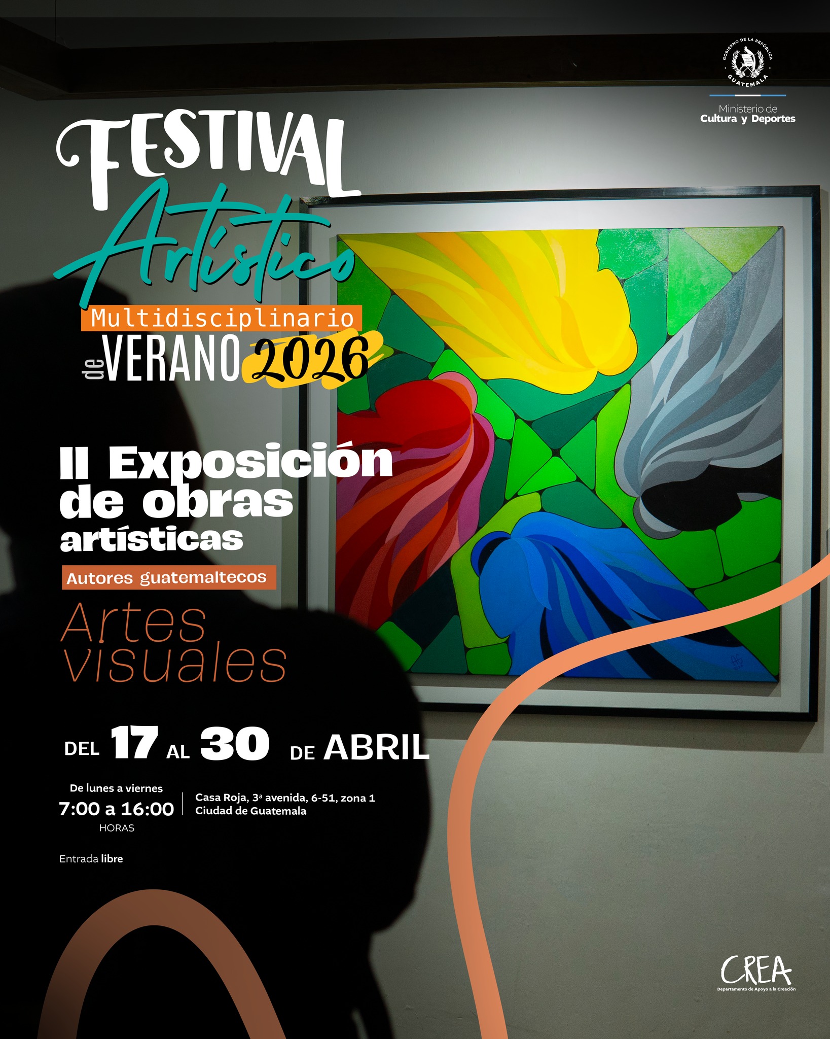 Te invitamos a la segunda exposición de obras artísticas del Festival Artístico Multidisciplinario de Verano organizado por el Departamento de Apoyo a la Creación. Ven a descubrir la riqueza de técnicas y visiones de nuestros autores guatemaltecos en un espacio dedicado a la creatividad.
