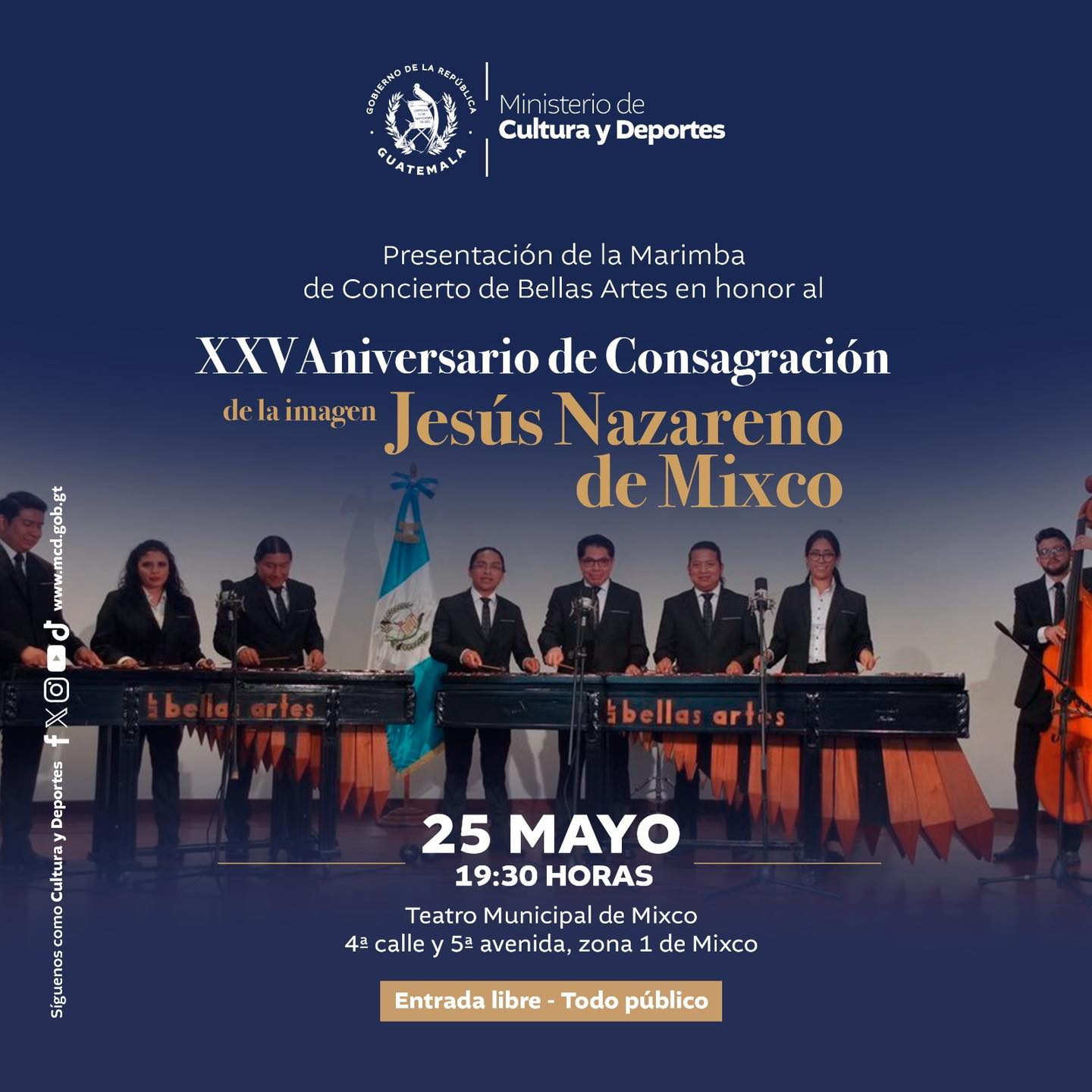 ¡Vamos al teatro! Nos emociona ser parte de las celebraciones culturales que enriquecen la identidad de los pueblos. Mixco conmemora el aniversario de la imagen de Jesús Nazareno y queremos que vivas una experiencia sonora inolvidable junto a la Marimba de Concierto de Bellas Artes Guatemala. Acompáñanos. La entrada es gratuita.
