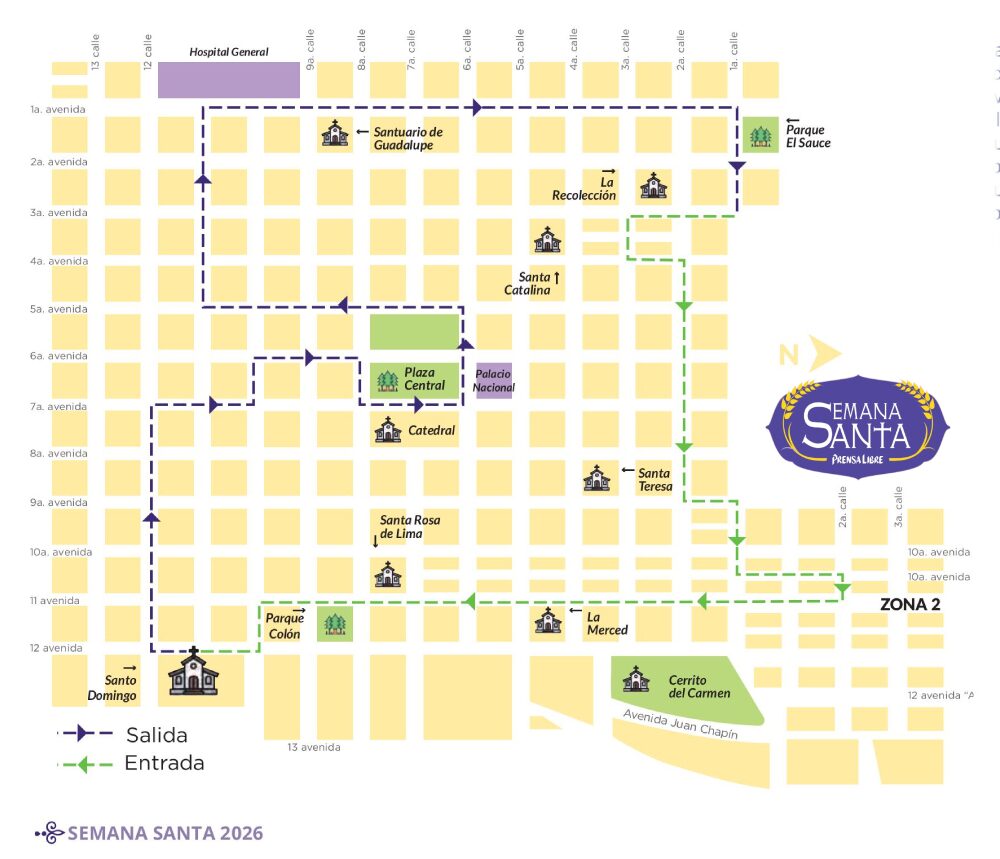 15:00 horas: Salida (atrio de la basílica) 17:05 horas: Catedral Metropolitana 18:15 horas: 5a. avenida y 10a. calle, zona 1 18:55 horas: Capilla de las Misericordias 20:25 horas: Parque El Sauce 21:15 horas: Templo La Recolección 22:25 horas: Parque Isabel la Católica 00:10 horas: Templo La Merced 01:15 horas: Atrio de la basílica