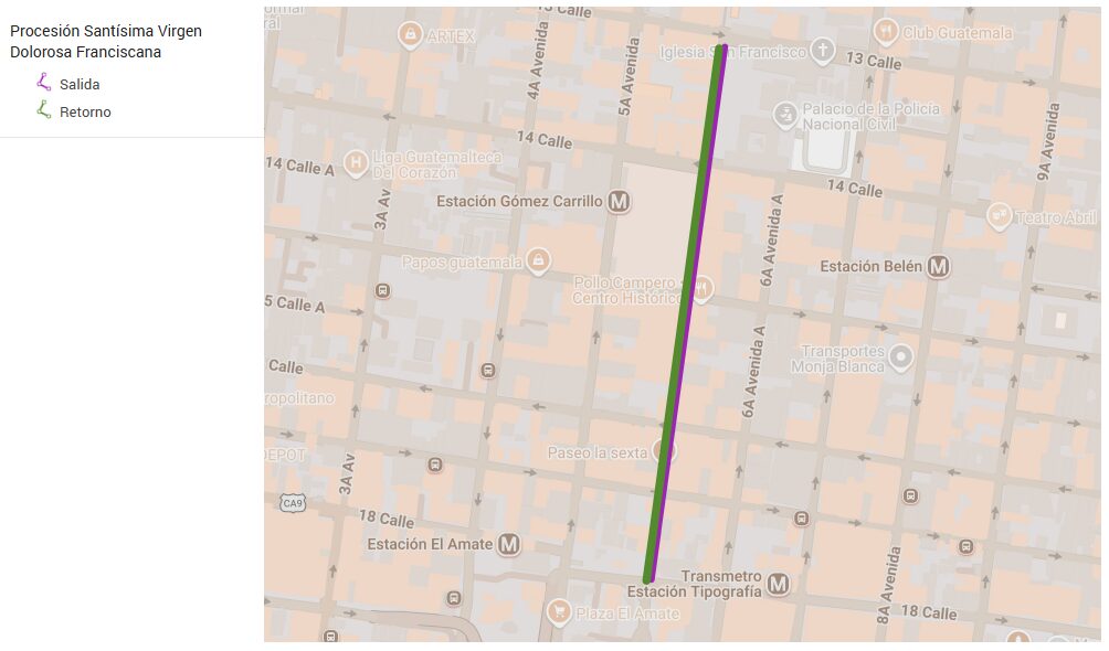 Recorrido de la Santísima Virgen Dolorosa Franciscana, que saldrá a las 15:00 horas y retornará a las 18:00 desde el Templo de San Francisco, en la zona 1