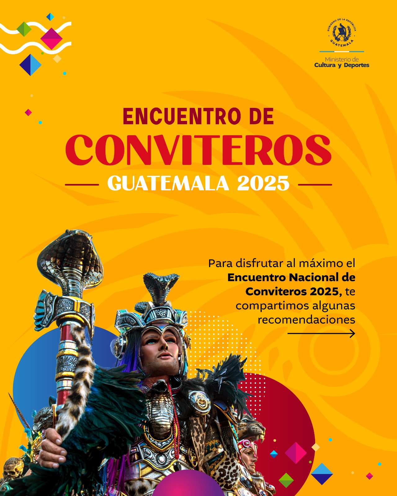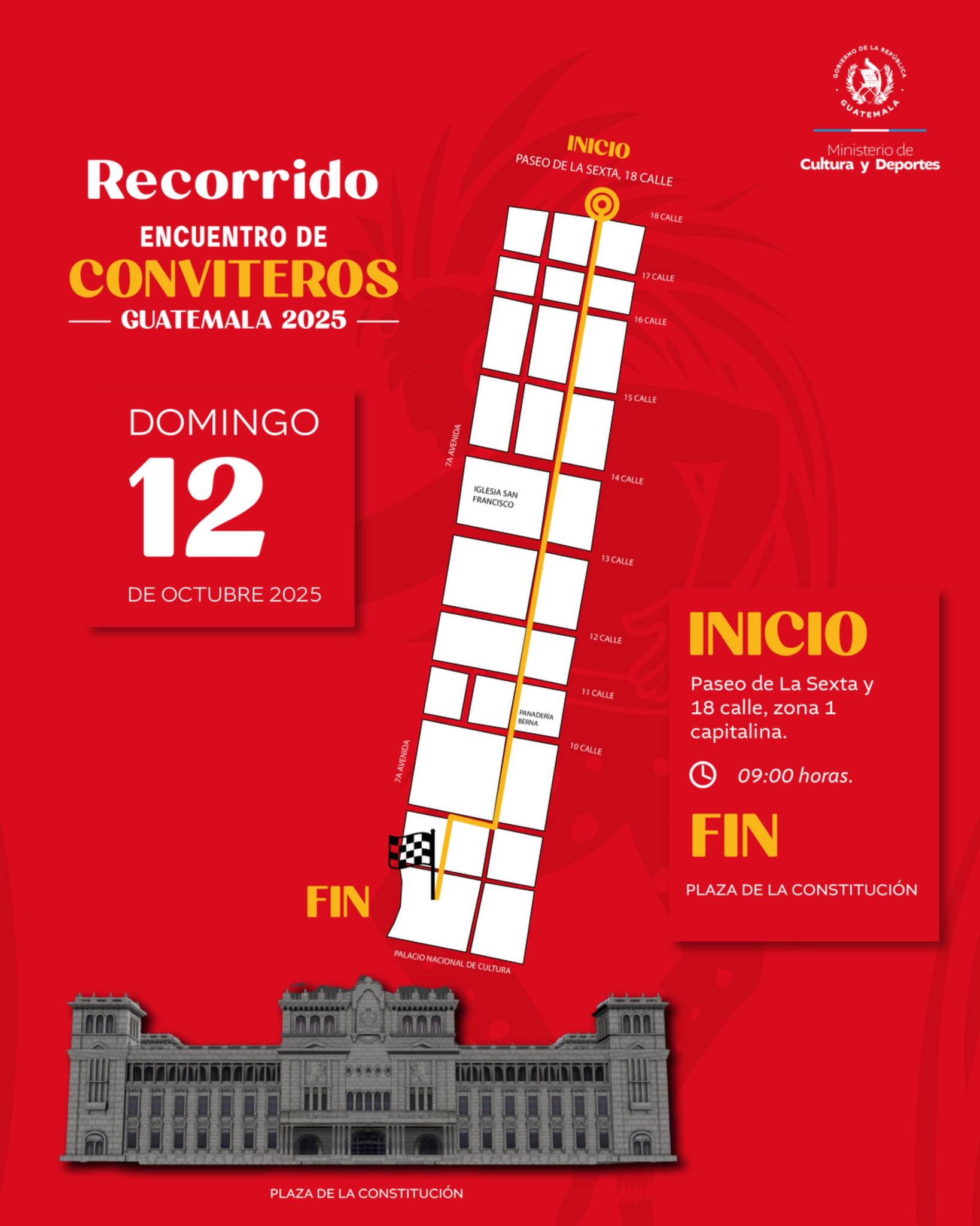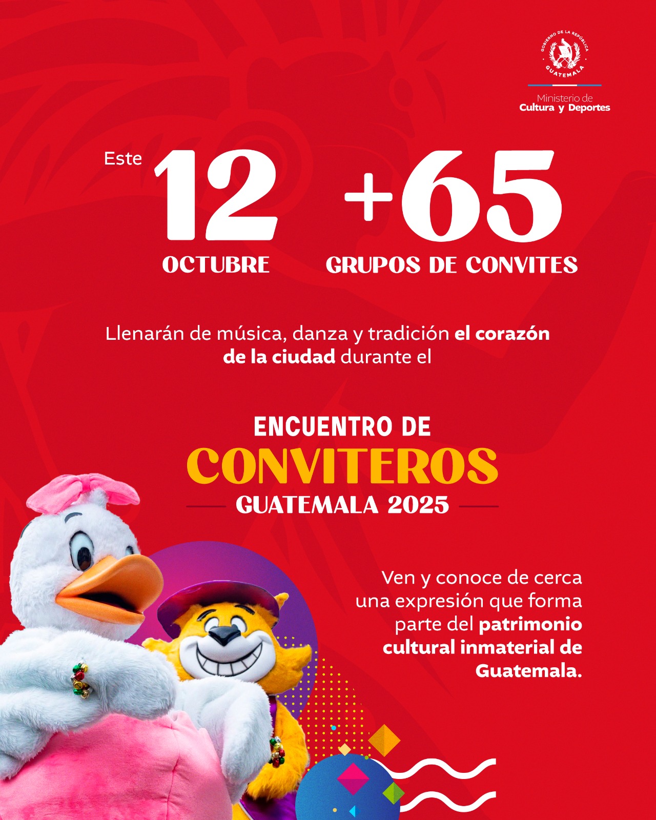 El Ministerio de Cultura y Deportes (MCD), a través de la Dirección General de Desarrollo Cultural, invita a la población al Encuentro de Conviteros Guatemala 2025 que se llevará a cabo este 12 de octubre desde las 9:00 horas en el Centro Histórico.