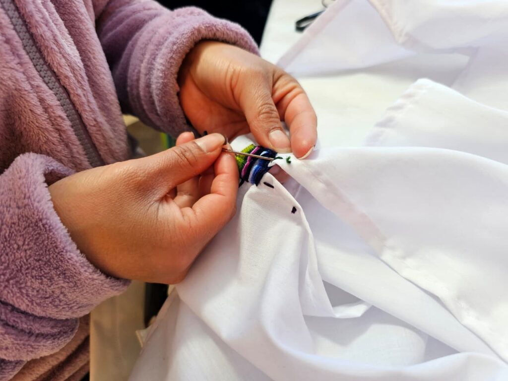 La metodología usada permitirá que las participantes aprendan a aplicar la técnica de bordado utilizando agujas e hilos de colores y bordando sobre randas a superficie del lienzo, hasta dar vida a la Uq´-Morga.