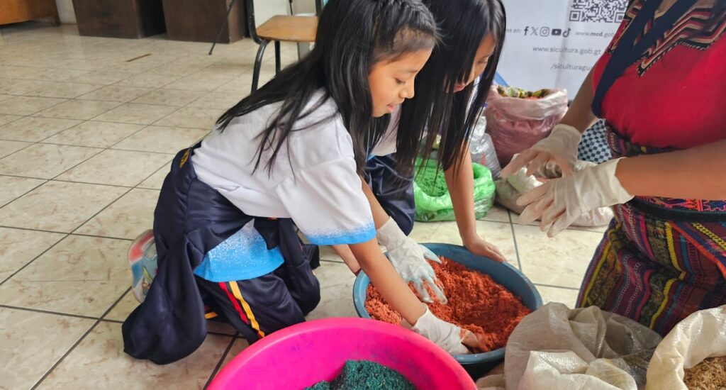 Con el propósito de mantener vivas estas técnicas, 45 estudiantes de la Escuela Oficial Urbana Mixta «Estados Unidos de América», jornada matutina, asistieron al taller Elaboración de aserrín teñido de forma artesanal en el marco de la Cuaresma y Semana Santa. La actividad se realizó el 19 de marzo en la Casa de Desarrollo Cultural de la localidad, en coordinación con el Museo Regional del municipio de Santiago Sacatepéquez, Sacatepéquez.
